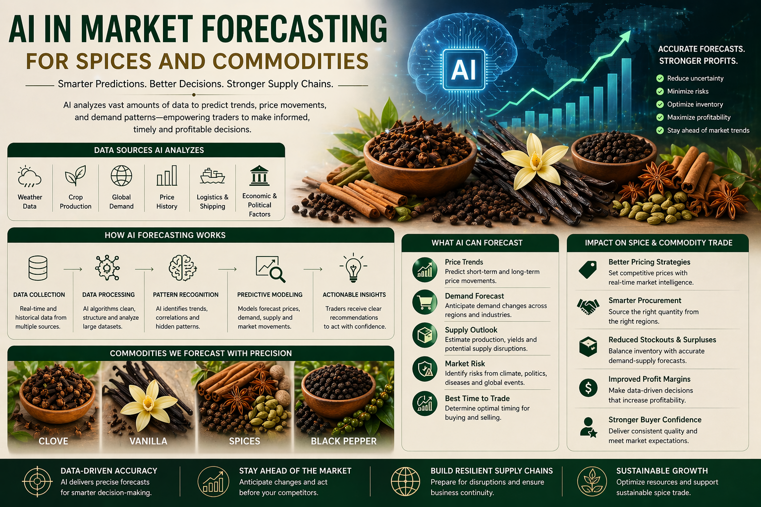 The global market for clove, vanilla, spices, and black pepper is highly dynamic, influenced by factors such as weather conditions, production levels, and changing consumer preferences. AI plays a crucial role in analyzing these variables and predicting market trends.